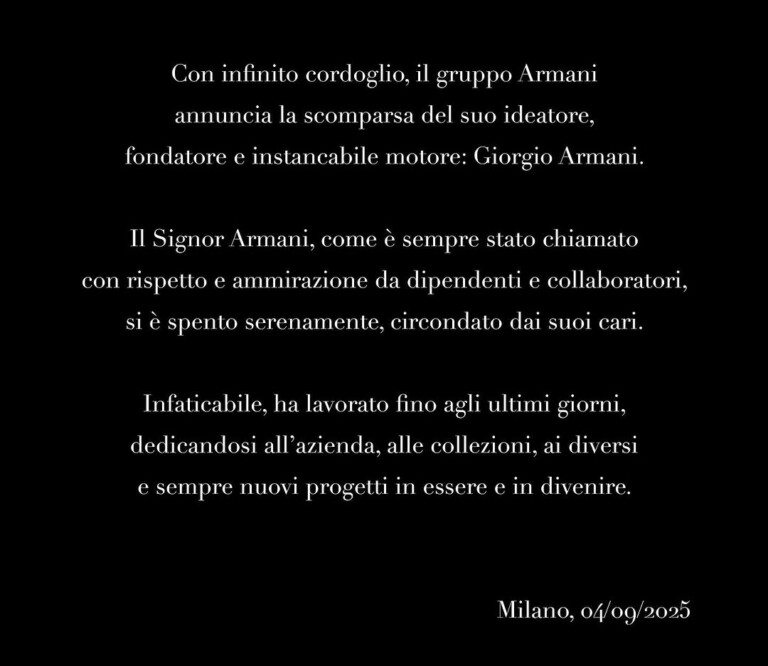 "Con infinito dolor, el Grupo Armani anuncia el fallecimiento de su creador, fundador e incansable motor: Giorgio Armani. El señor Armani, como siempre fue llamado con respeto y admiración por empleados y colaboradores, falleció serenamente, rodeado de sus seres queridos. Incansable, trabajó hasta sus últimos días, dedicándose a la empresa, a las colecciones, y a los distintos proyectos, siempre nuevos, en curso y por venir."